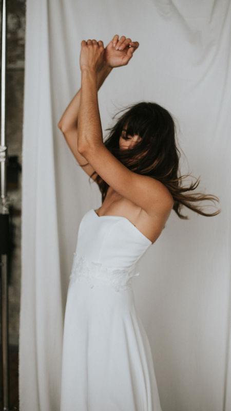 Lyra abandonne l'orchestre pour un récital soliste. Son bustier au décolleté légèrement cœur dévoile les épaules et souligne la taille. Elle se prête à tous les jeux : ceinture fleurie, sur-top en dentelle ou sur-jupe vaporeuse.